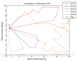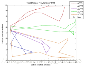 上面得到的后代染色体表明所有AGV路径总距离为65,最大路径距离单AGV是17。显然,得到的S所有AGV路径总距离和最大单AGV路径距离比原来的A,B,和C都小。