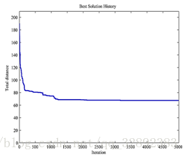 在仿真中,假设一个5台 AGV和50个工作站的生产场景,并满足在第2节列出的要求和双路径约束条件。设置种群大小为200,应用所提出的新遗传算法进行路径优化。两种遗传算法的仿真结果如图3-6所示。图3和图4表明,在3000次迭代中,新遗传算法的总路径距离为72,传统遗传算法的路径距离为86。图表明,在60次迭代中,传统遗传算法的最大AGV距离为34,新遗传算法的最大距离为32。图10显示了这两种算法使用条形图之间的距离比较。从仿真中,我们可以得到: