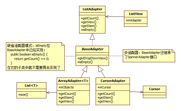 ListView需要ListAdapter的getCount(),getItem(),getView()等方法,为了兼容List<T>,Cursor等数据类型作为数据源,专门定义两个适配器来适配他们:ArrayAdapter和CursorAdapter。