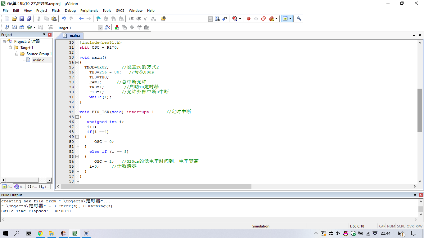 图中P1.0引脚就是虚拟的示波器,接下来就是代码编程,我给了注释如下。