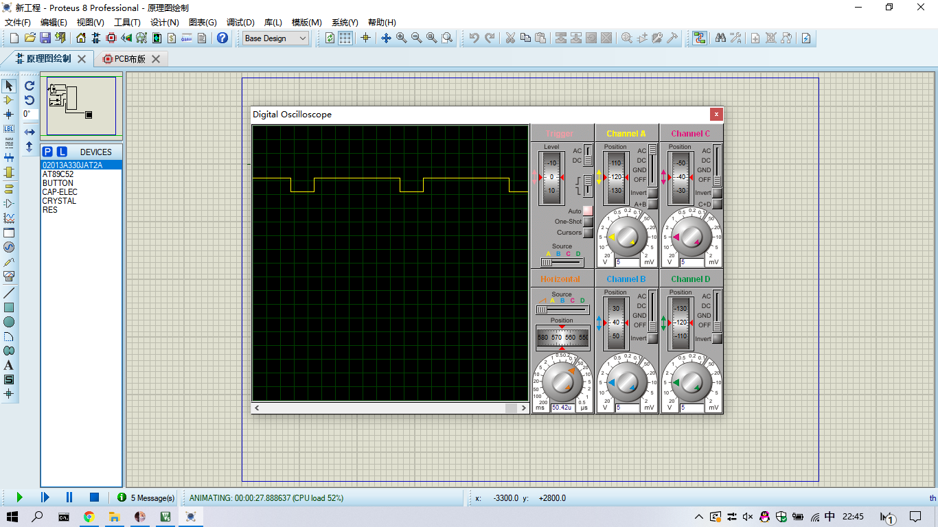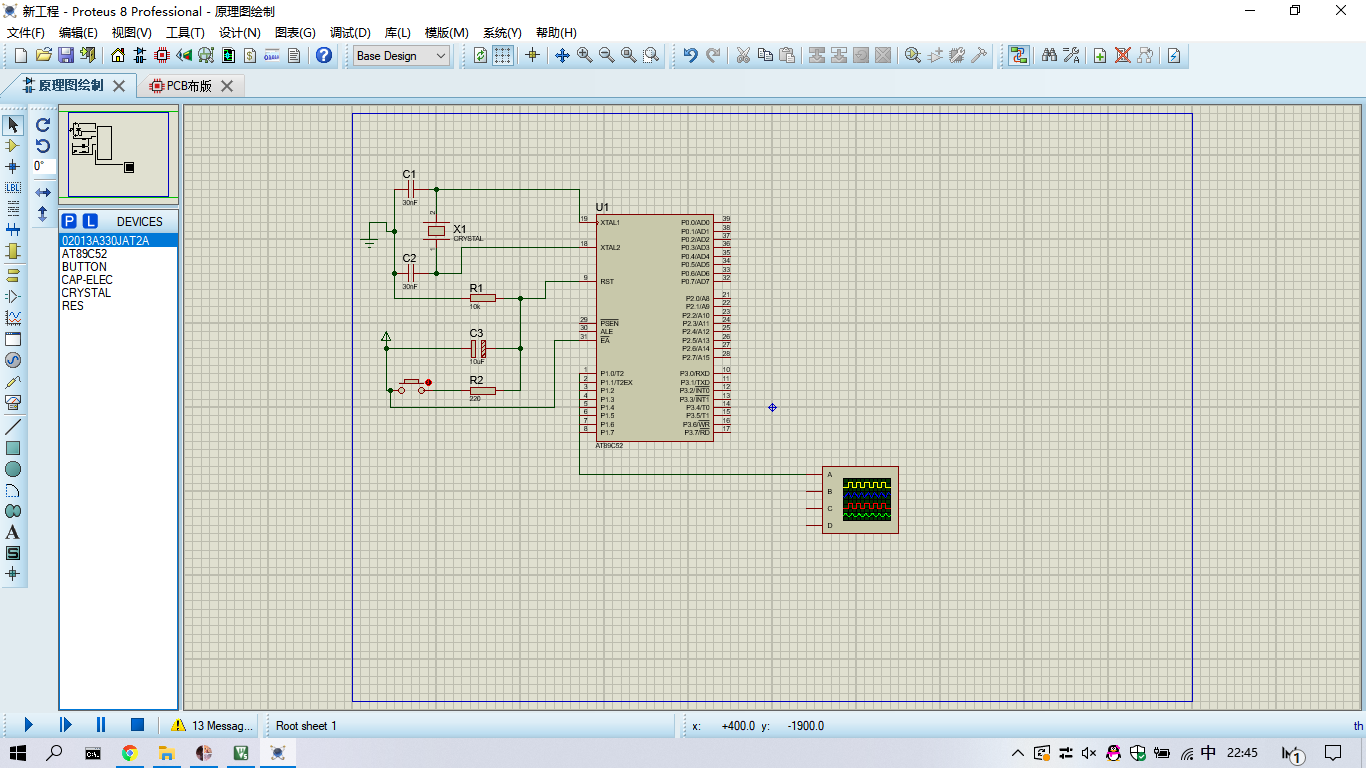 【例】使用T0,方式2,在P1.0输出周期为400µs,占空比为4:1的矩形脉冲,要求在P1.0引脚接有虚拟示波器,观察P1.0引脚输出的矩形脉冲波形。