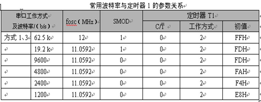 在单片机的应用中,常用的晶振频率为:12MHz和11.0592MHz。所以,选用的波特率也相对固定。常用的串行口波特率以及各参数的关系如表所示。