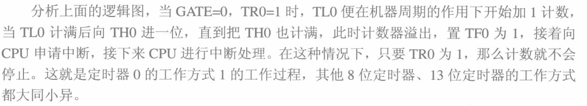 方式1的技术位数是16bit,对T0来说, TL0寄存器作为低8bit,TH0寄存器作为高8bit,组成了16bit加1计数器,逻辑结构框图如下