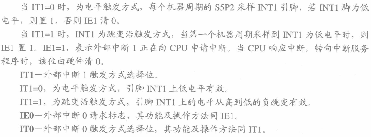 - INT1 - 外部中断1,由P3.3端口线引入,低电平或下降沿引起