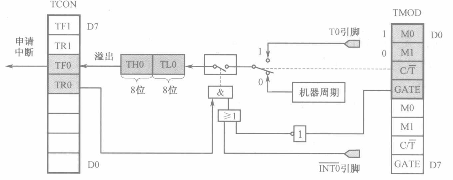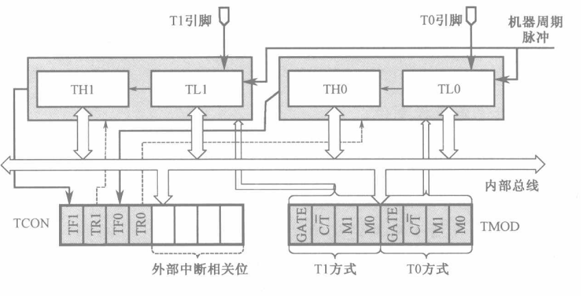 定时器/计数器的实质是加1计数器(16位), 由高8位和低8位两个寄存器组成,
