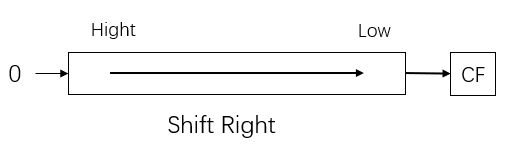 功能:右移一次,最高位补0.区别!最低位送入CF标志位。如图: