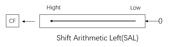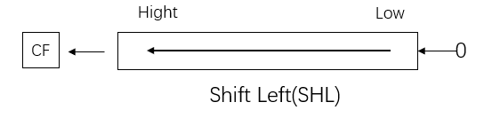 功能:左移一次,最低位补0,最高位送入CF标志位,如图: