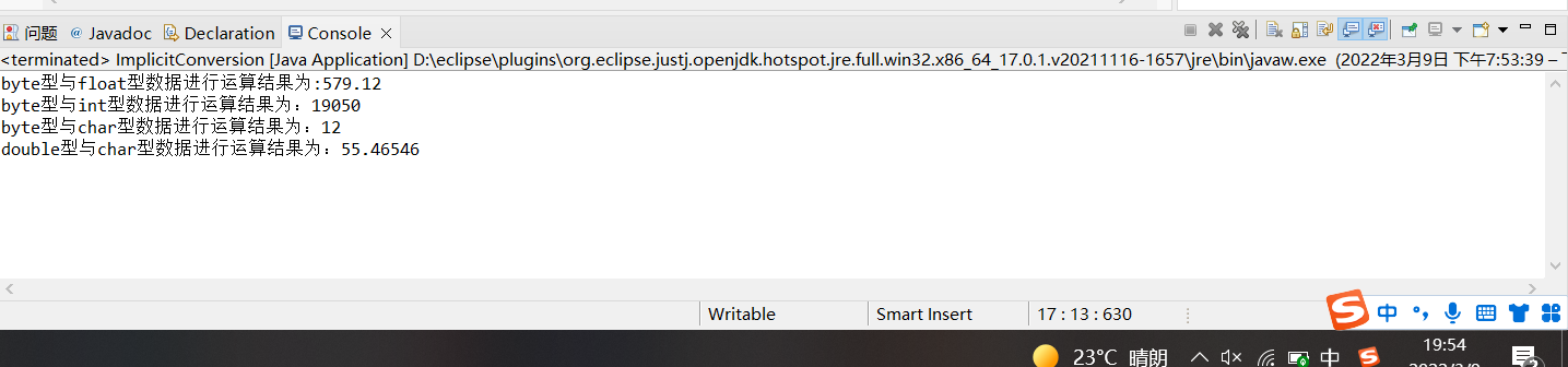 从低级类型向高级类型的转换,称为隐式转换,也可以称为自动转换。下列基本数据类型会涉及数据转换,不包括逻辑类型。这些类型按精度从“低”到“高”排列的顺序为byte<short<int<long<float<double。