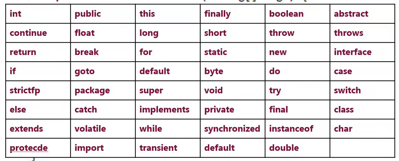 关键字是Java语言中已经被赋予特定意义的一些单词,不可以把这些字作为标识符来使用。简单理解为凡是在Eclipse变成红色粗体的单词,都是关键字。Java语言中的关键字如图所示:
