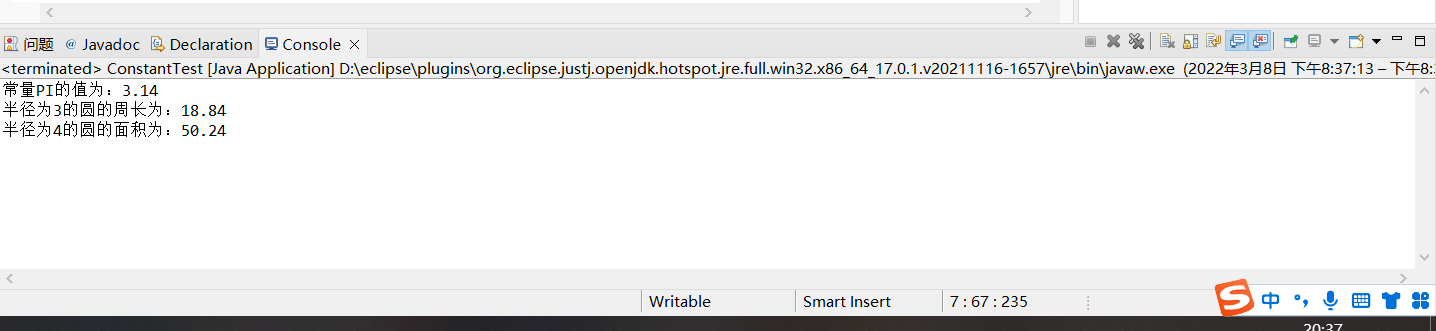 例2.1 声明double型常量,并给常量赋值,使用常量进行计算。