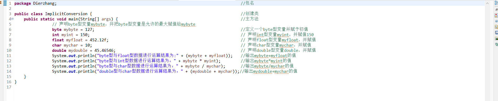 例2.7 创建不同数值类型的变量,进行隐式转换。