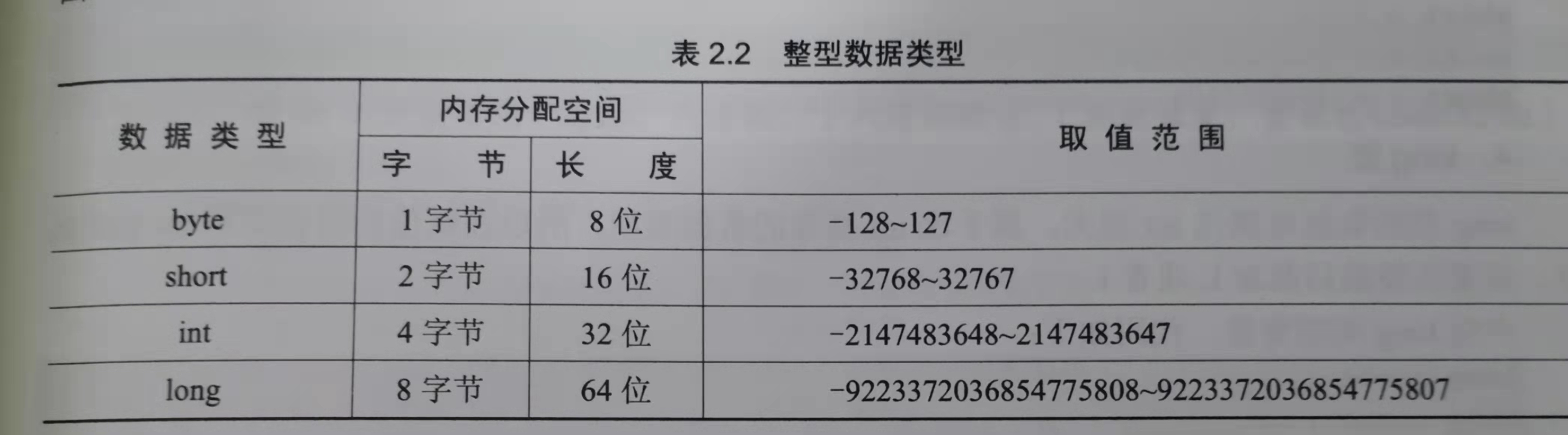 整数类型用来储存整数数值,即没有小数部分的数值,可以是正数,也可以是负数,整型数据根据它在内存中所占大小的不同,可分为byte、short、int和long 4种类型。它们具有不同的取值范围,如图所示:
