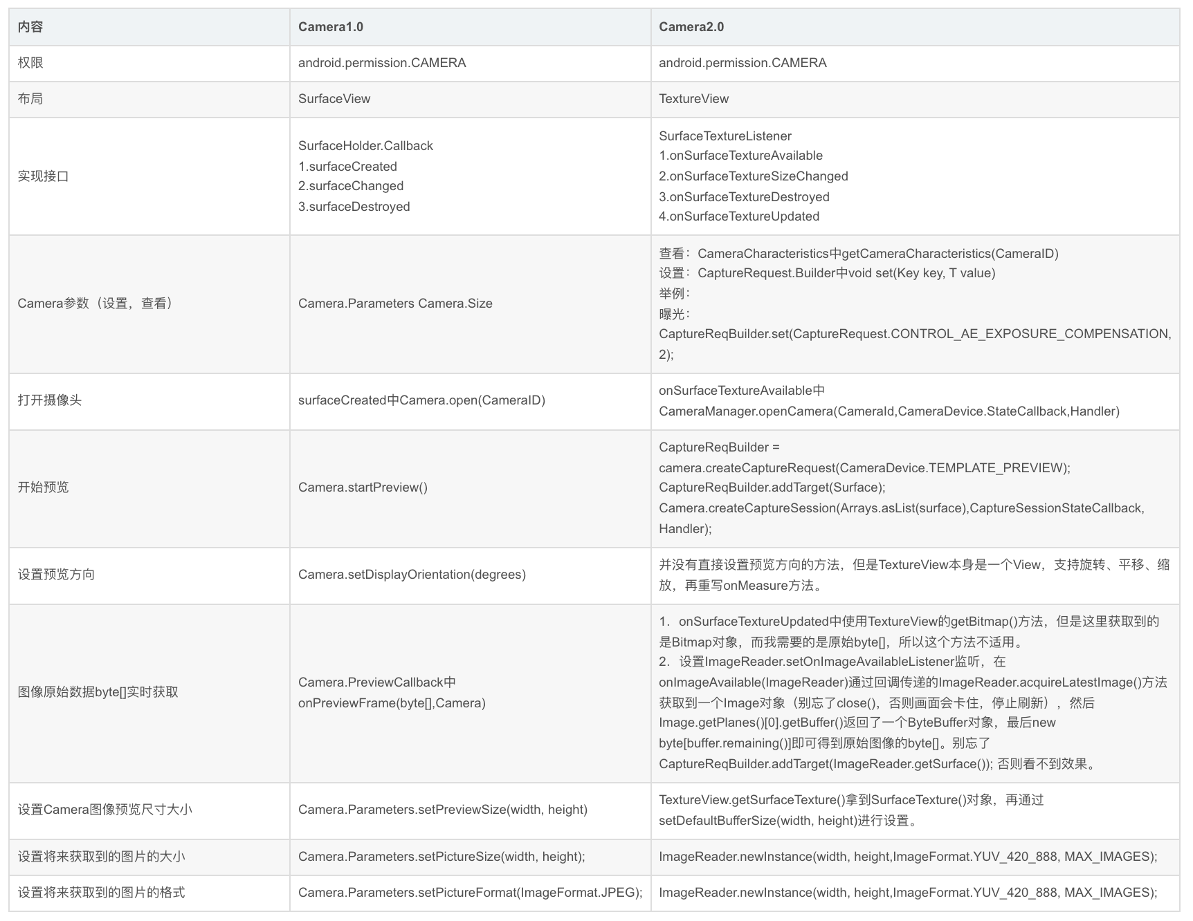 之所以会出现 Camera1Capturer 类和 Camera2Capturer 类两套不同的 API 方案,主要是因为谷歌在开发 Android 5.0 时,对摄像头 API 进行了全新的颠覆性设计,新增了全新的 Camera V2 接口,这些 API 不仅大幅提高了 Android 系统拍照的功能,还能支持 RAW 照片输出,甚至允许程序调整相机的对焦模式、曝光模式、快门等。