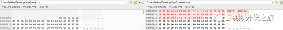 通过Beyond Compare对比pcm和wav发现,正如我们代码所示,在pcm数据源前加了44个字节的wav头