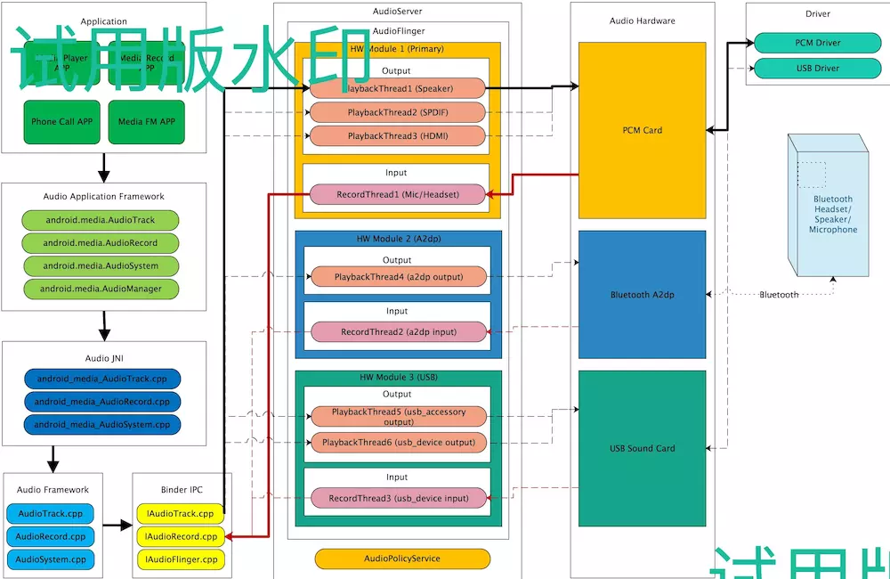 每类音频外设模块(HW Module)会实现一份 Audio HAL,AudioServer 将处理后的音频流发送至 Audio HAL,Audio HAL 再将音频流转发至对应的驱动或外设实现播放。声音录制流程则正好相反。