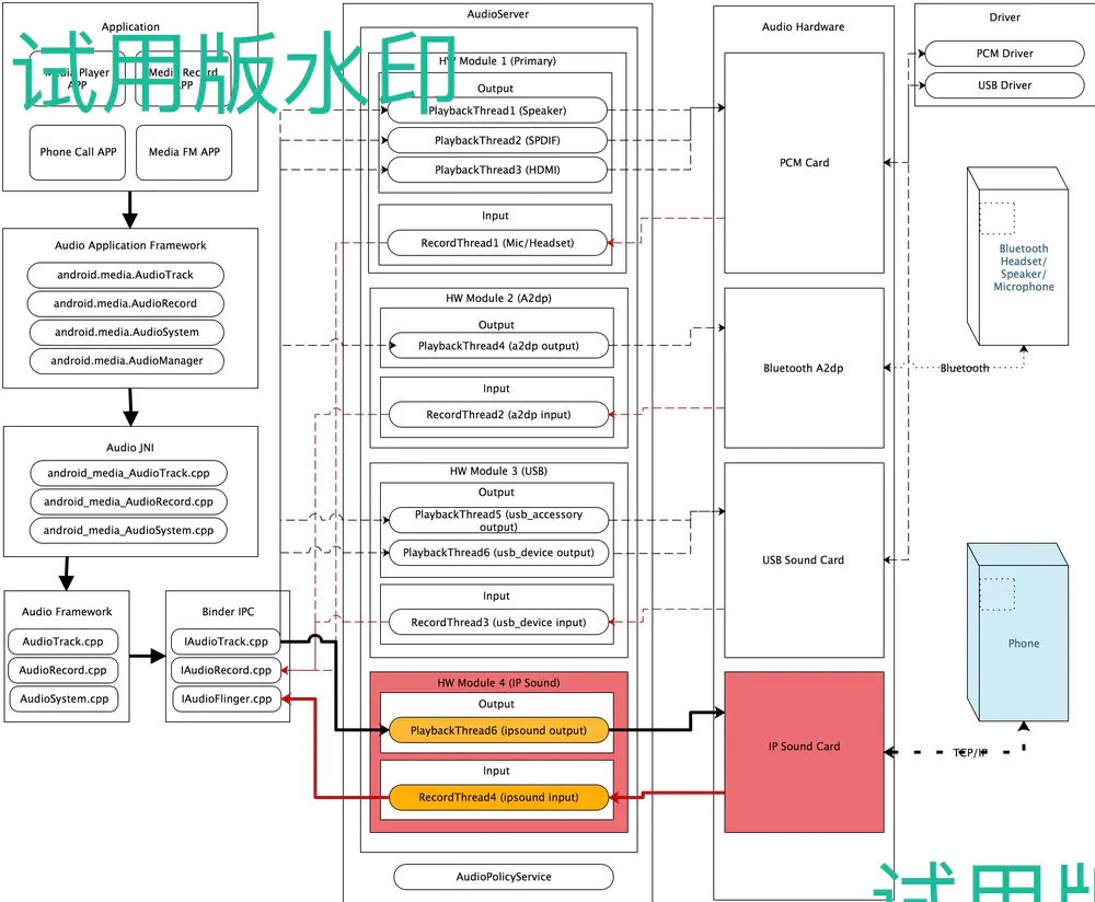 按照以下架构扩展名为 IP Sound Card 的声卡,AudioPolicyService 增加新的策略用于切换到 IP Sound Card 通路,实现 IP Sound Card HAL,HAL 中将收到音频数据,收到数据后通过提前建立好的 TCP/IP 连接发送到远程终端。