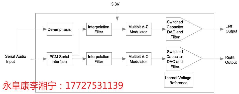 该系列产品基于一个多比特位的Δ-Σ调制器,将数字信号转化成两个声道的模拟信号并经过模拟滤波器滤波。该Δ-Σ调制器对时钟抖动的敏感度很低,且在带宽范围外具有极低的噪声。其还可使用采样率和主时钟比作为自采样率(2kHz – 200kHz),从而实现自动检测采样频率的功能。