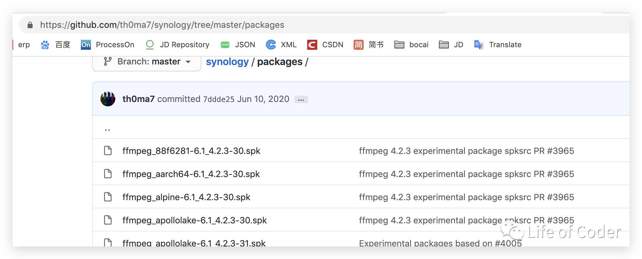首先我们需要去下载最新的支持DTS的ffmpeg包,下载地址为:https://github.com/th0ma7/synology/tree/master/packages。在该网站根据自己的机器的信号找到对应的版本下载即可(一定要选择和你的机器匹配的版本,如果有两个包就选择最新的)。