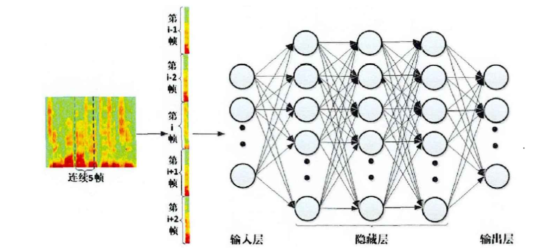 输入:这里采用较为简单地特征,即带噪声语音信号的幅度谱,也可以采用其他的特征。值得一提的是,如果你的输入是一帧,对应输出也是一帧的话效果一般不会很好。因此一般采用扩帧的技术,如下图所示,即每次输入除了当前帧外还需要输入当前帧的前几帧和后几帧。这是因为语音具有短时相关性,对输入几帧是为了更好的学习这种相关性