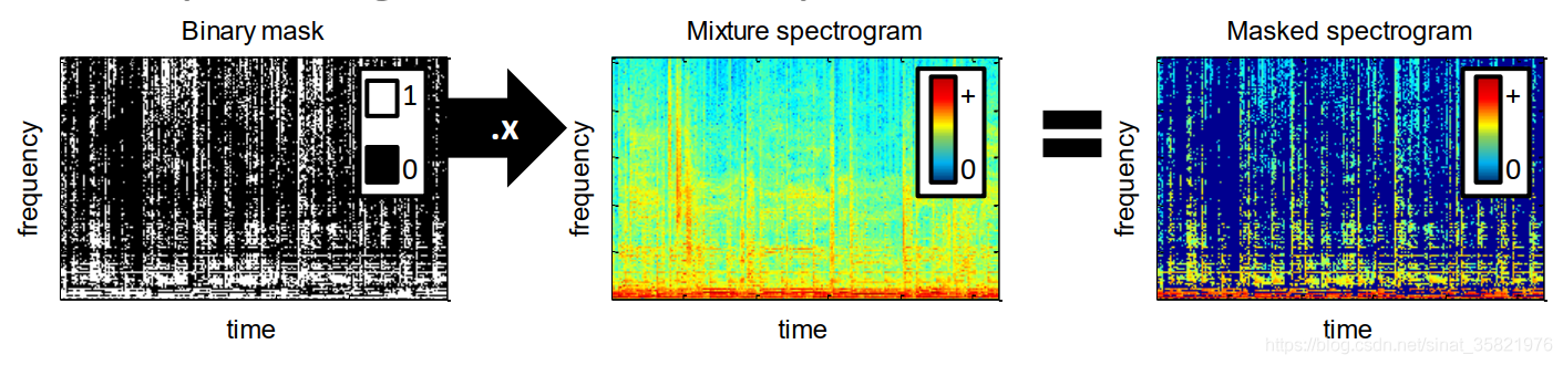 我们通过0和1的二值掩码然后乘以混合信号的语谱图就可以得到我们想要喜好的语谱图了,如下图所示。