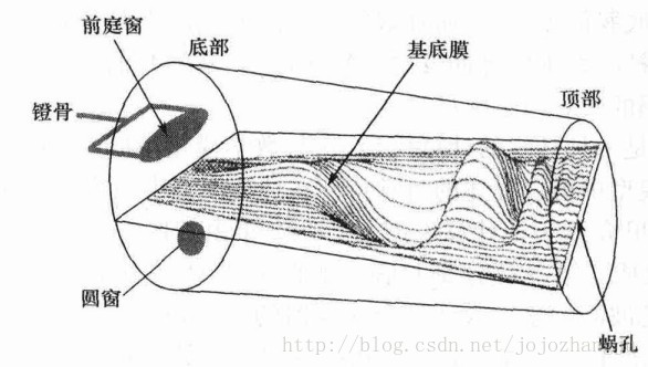 当声音经过外耳传入中耳时,镫骨的运动引起耳蜗内流体压强的变化,从而引起行波沿基底膜的传播。