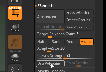 在 zremesher 中打开 use polypaint , 然后点击 zremesher . 可以看到