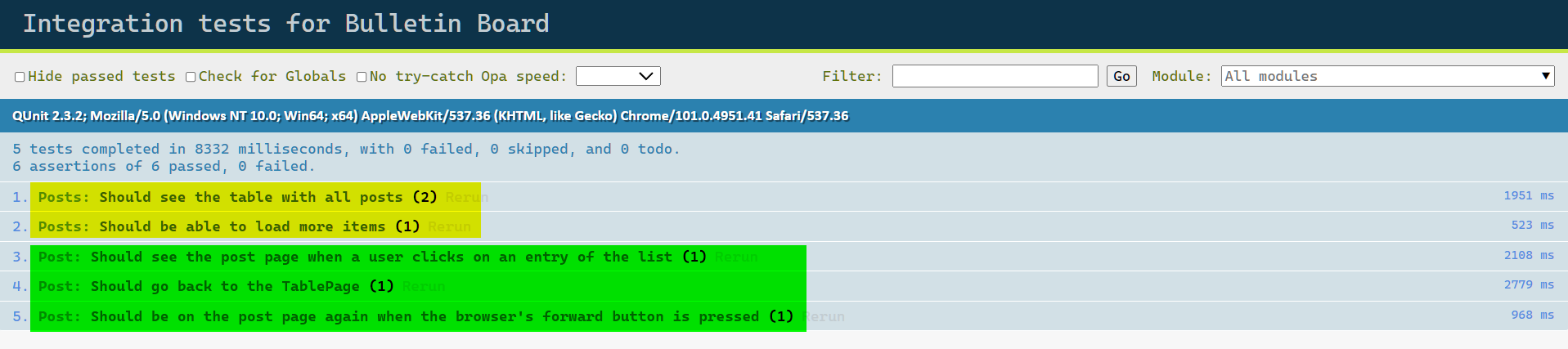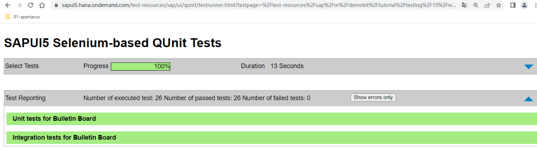 下图是 SAP UI5 OPA 集成测试用例执行结果的报表: