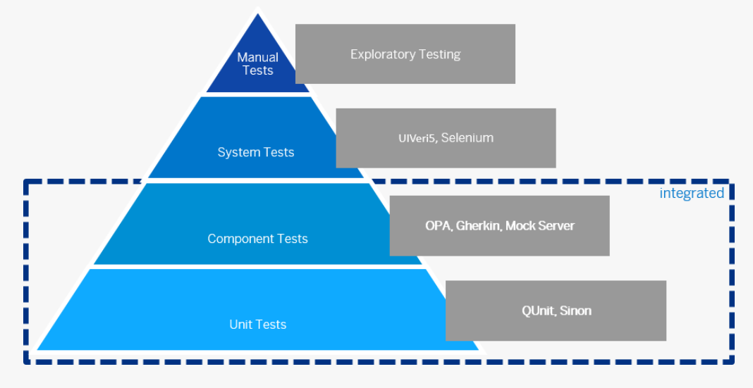 本教程之前的文章,我们已经介绍了测试金字塔理论里的单元测试(Unit Tests)和组件测试(Component Tests)概念,介绍了如何用 SAP UI5 QUnit 和 OPA 这两个框架,编写单元测试用例和集成测试用例:
