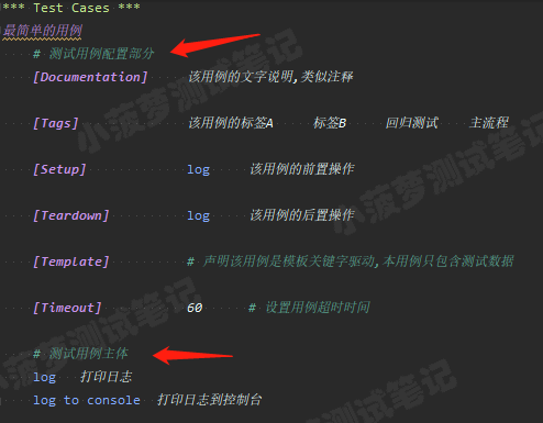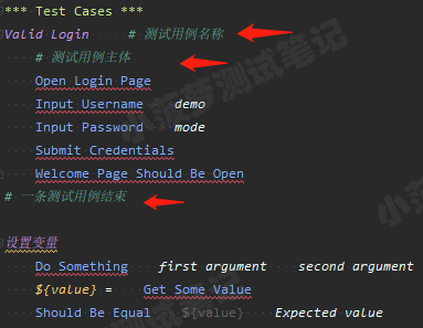 - 用例主体由关键字、变量组成,如果关键字需要用到参数,关键字和参数之间至少空两个空格;若有多个参数,参数间也是至少两个空格【因为两个空格是 RF 的分隔符】