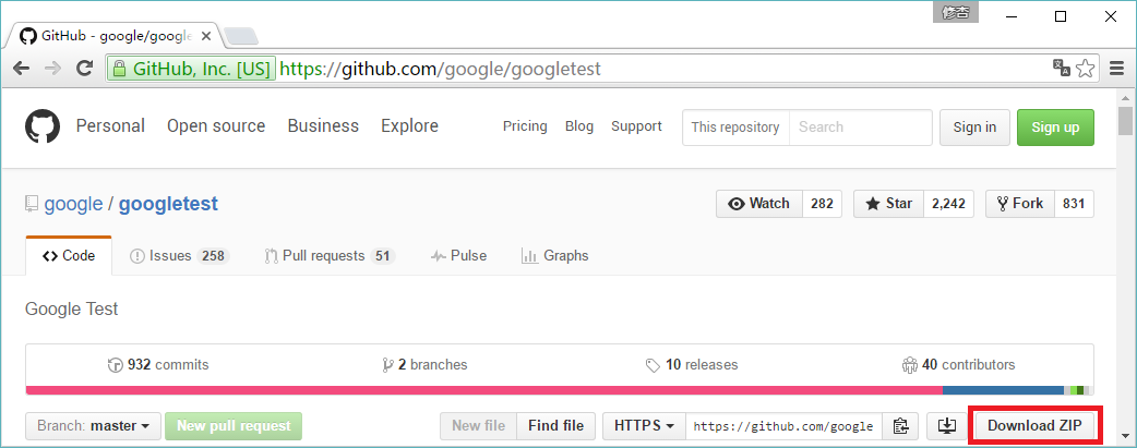 在github的页面上可以直接下载打包好的gtest,下载入口如下图所示: