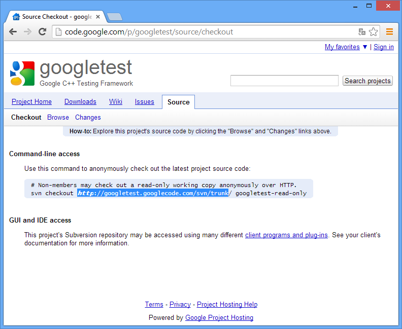 代码页面:http://code.google.com/p/googletest/source/checkout