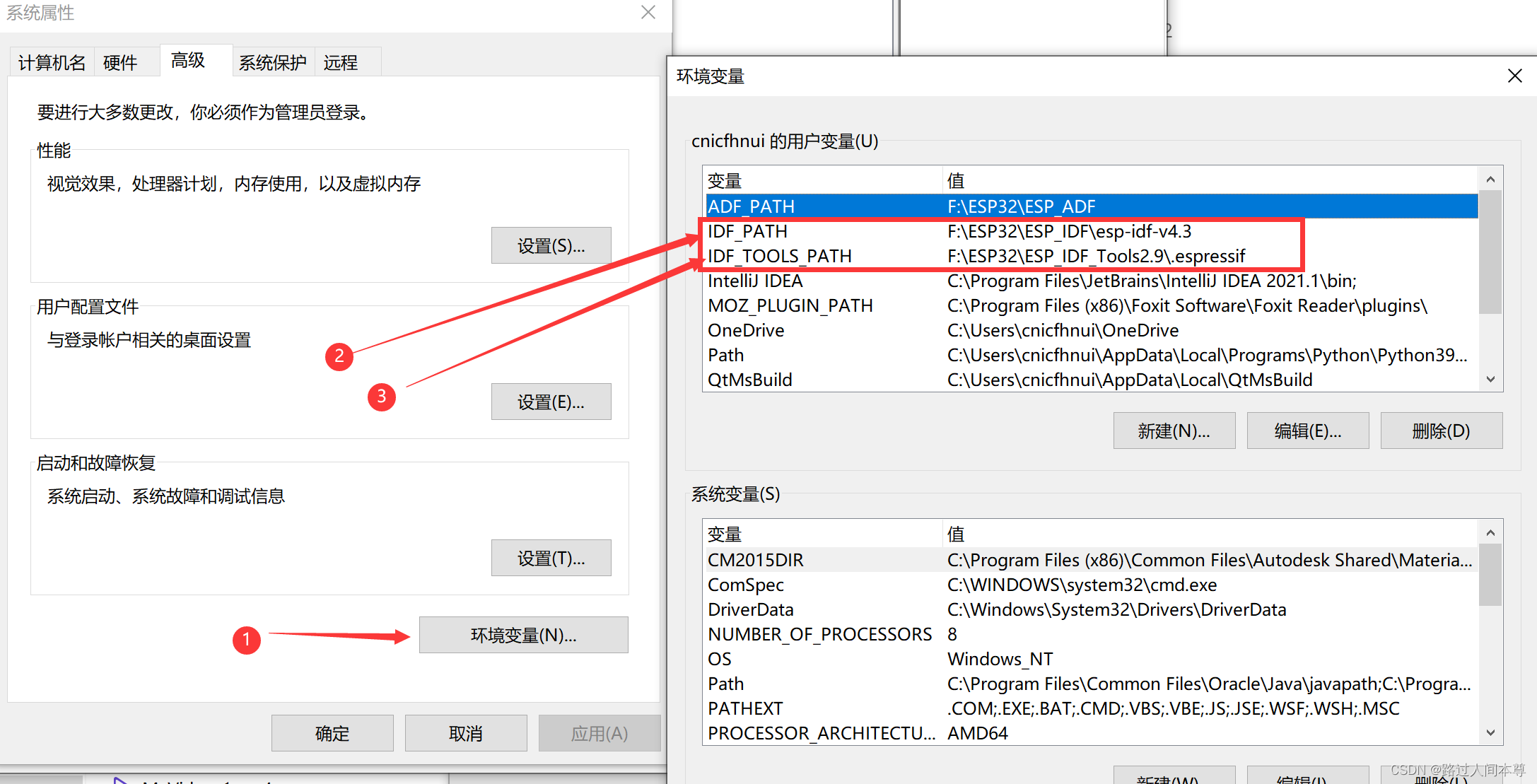 重要的一步,检查你的系统环境变量,在用户变量中检查是否有 IDF_PATH和IDF_TOOLS_PATH这两个环境变量,如果没有的话,创建一下,注意你自己的目录