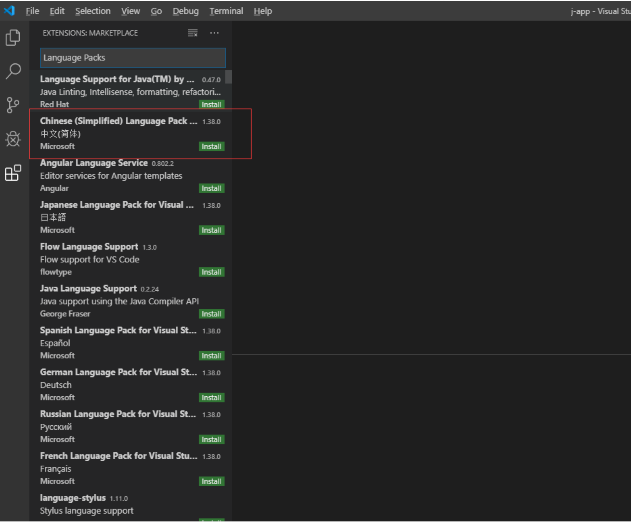 在左侧“扩展”视图文本框中输入“Language Packs”,点击你所需要的语言,这里我们安装的是中文简体,安装完成右下角弹出一个重启按钮,点击重启,语言自动切换