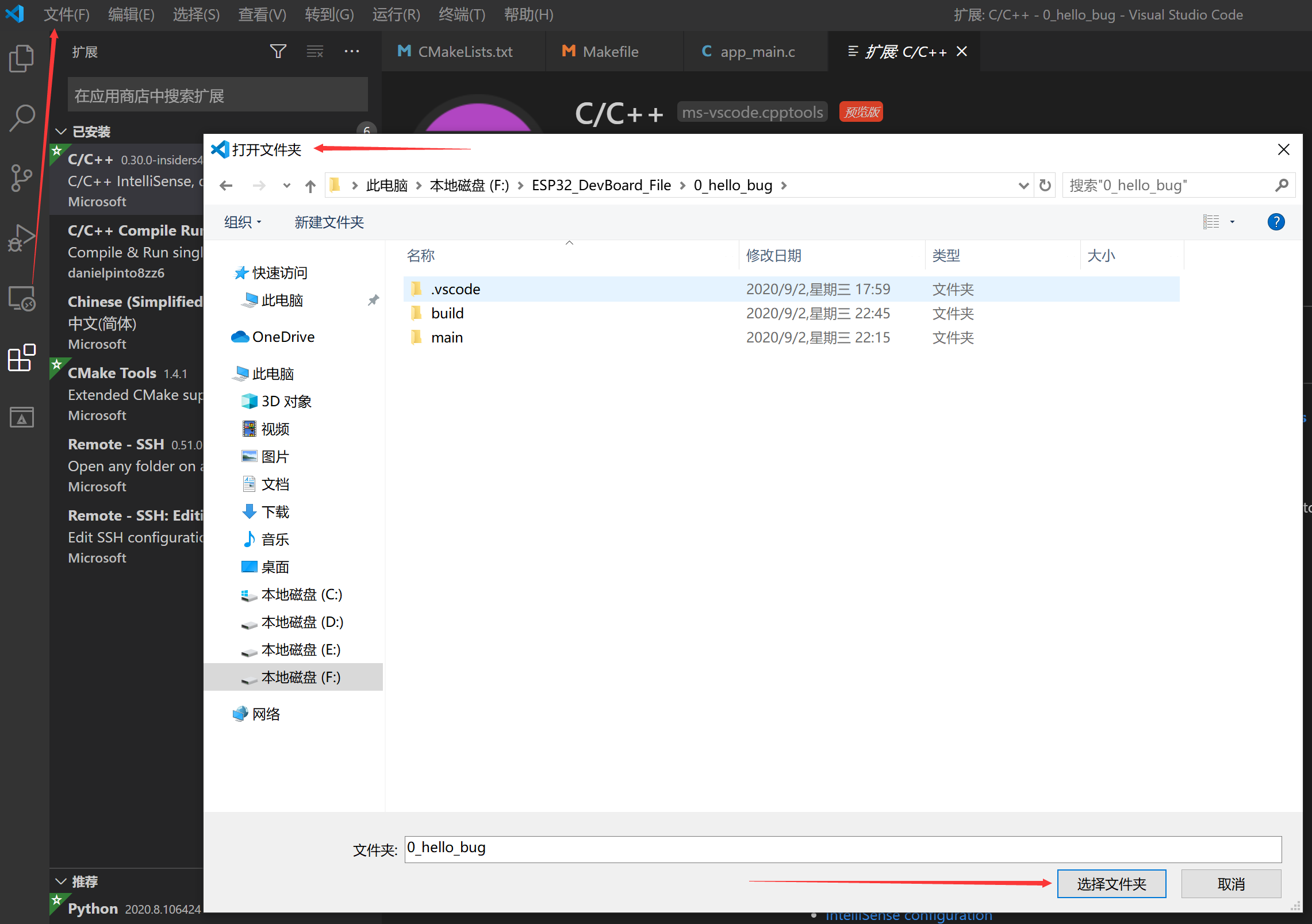 例:cd F:ESP32_DevBoard_File _hello_bug
