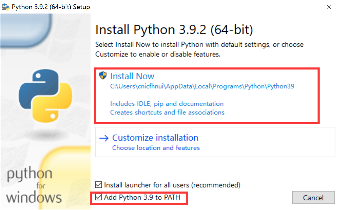 一定一定要勾选Add Python3.9 to PATH,单击Install Now开始安装,