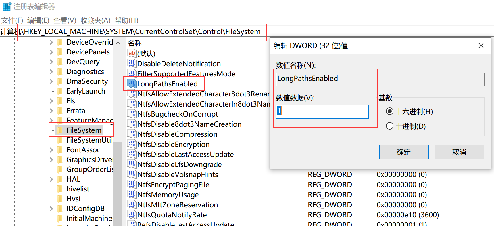 解决办法2:打开注册表 HKLMSYSTEMCurrentControlSetControlFileSystemLongPathsEnabled 设置为 1。该操作需要管理员权限。