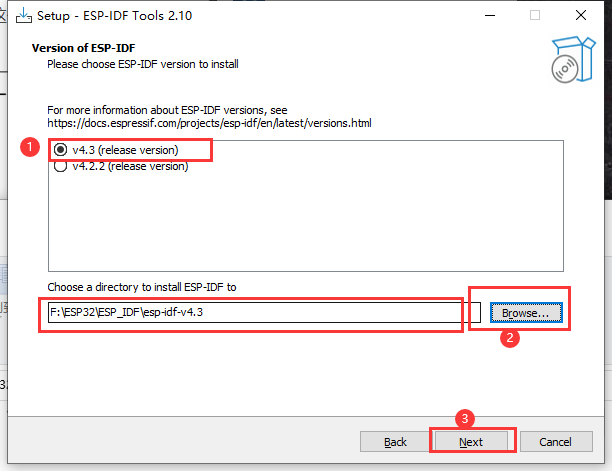 接下来安装idf库,选择最新的V4.3版本,单击Browse选择或与直接输入方式(F:ESP32ESP_IDFesp-idf-v4.3这个目录是我新建的,当然你们也可以自己创建,最好和后期的源码放在同一磁盘下),选择安装位置。单击下一步