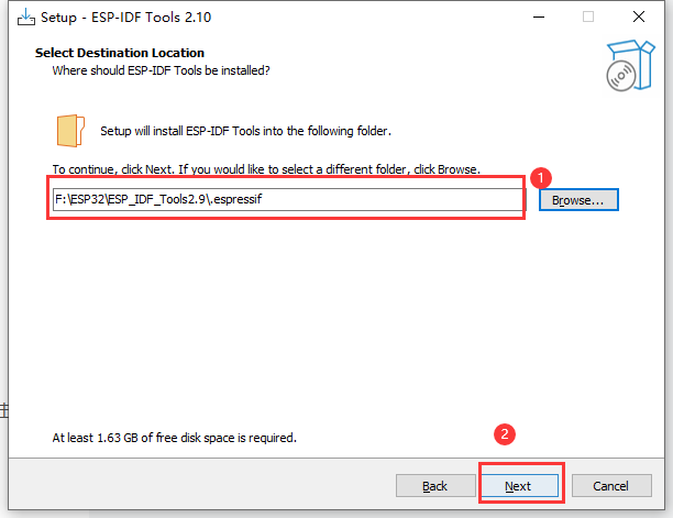 接下来选择idf tools的安装目录(F:ESP32ESP_IDF_Tools2.9这个目录是我自己建立的).espressif是安装程序自动加的,不用管,单击下一步