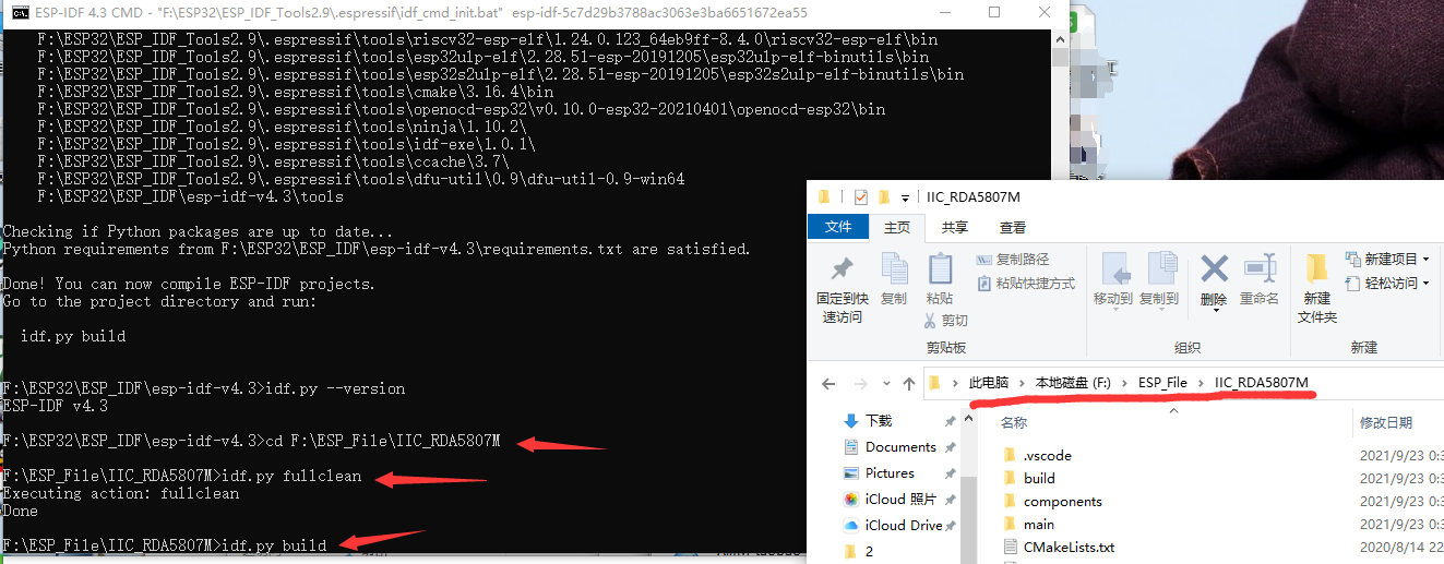 至此,idf工具安装完成,现在就可以直接在这两个窗口内编译你的esp32工程了。