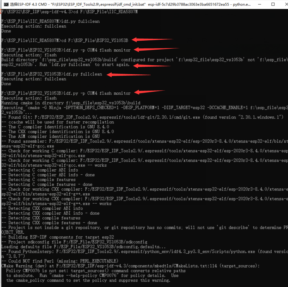 使用idf.py fullclean命令清除这个工程(此步可不要)