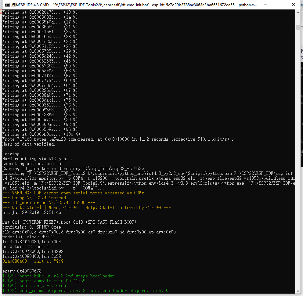 idf.py -p COM4 flash monitor 其中COM4 是设备管理器中我的开发板串口号