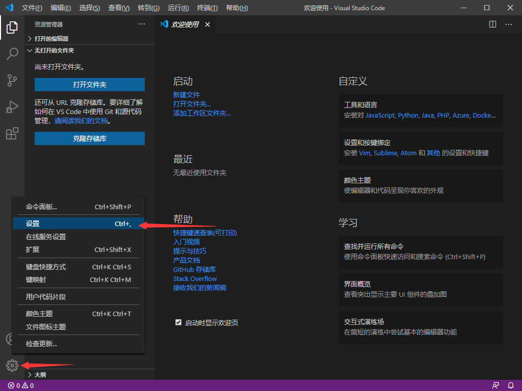 打开你的vscode,单击左下角的齿轮按钮,里面选择设置菜单,打开code的设置