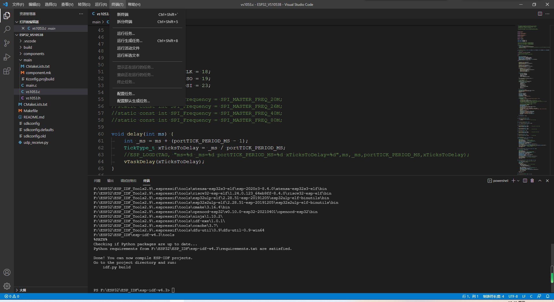 单击文件菜单,选择打开文件夹,打开一个工程目录,再单击菜单终端,选择新终端,在code下方会显示终端并已经运行IDF环境,我code版本是1.6,只能使用powershell,cmd的话会自动切换到工程目录,直接输idf命令即可,powershell终端的话要用cd 命令手动来切换到你的当前源码目录,你可以在code左侧的文件结构空白处单击右键选择复制目录,然后再cd 粘贴到命令行来切换目录