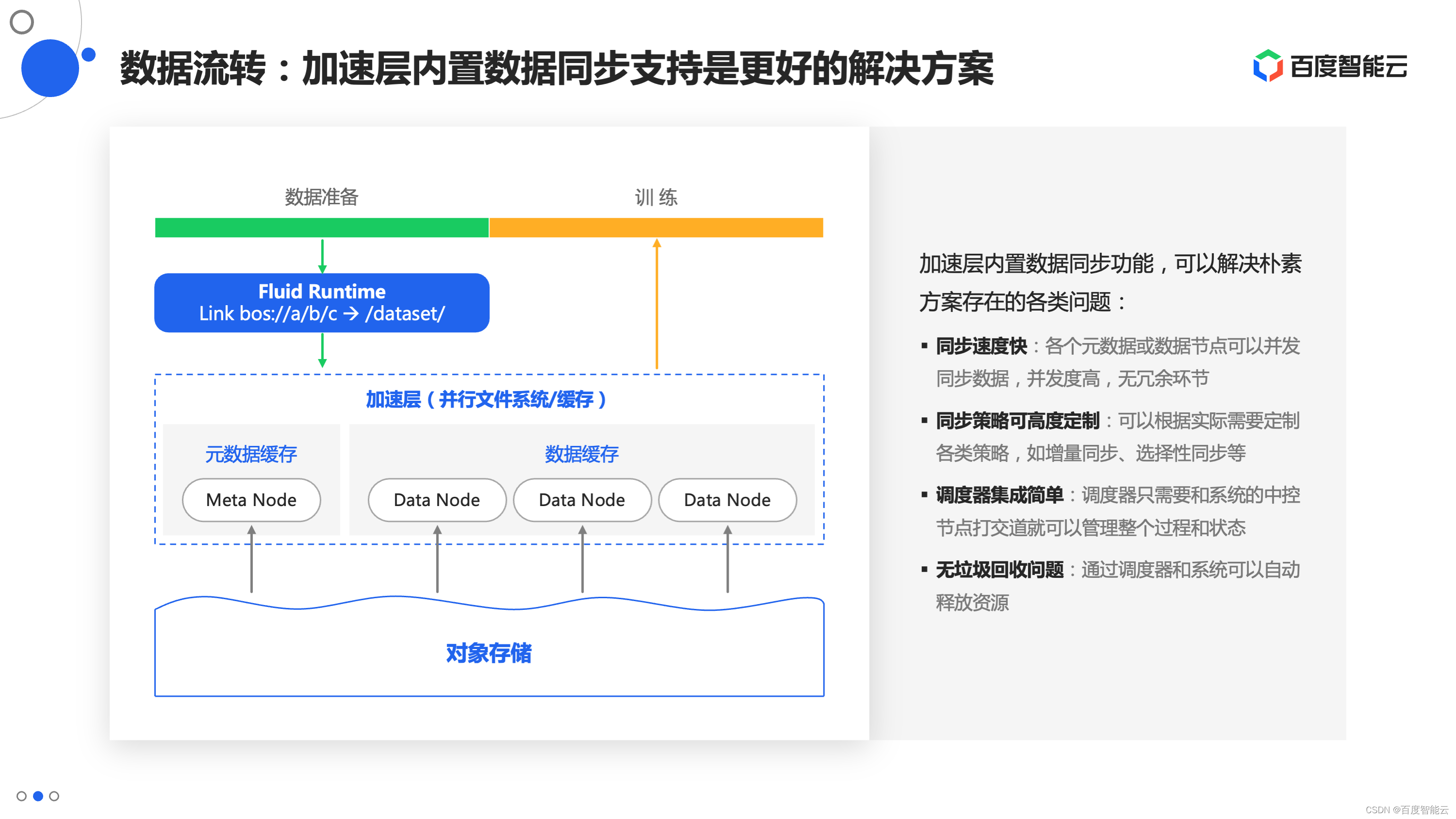 回到我们今天的主题,存储这部分在平台化训练和云原生训练阶段面临的问题是一致的。在这两个阶段,我们会发现很多时候数据的来源是速度较慢的大容量存储或者数据湖。这就导致在真正开始训练前,需要一个数据准备的阶段,将数据搬到速度更快的存储里。