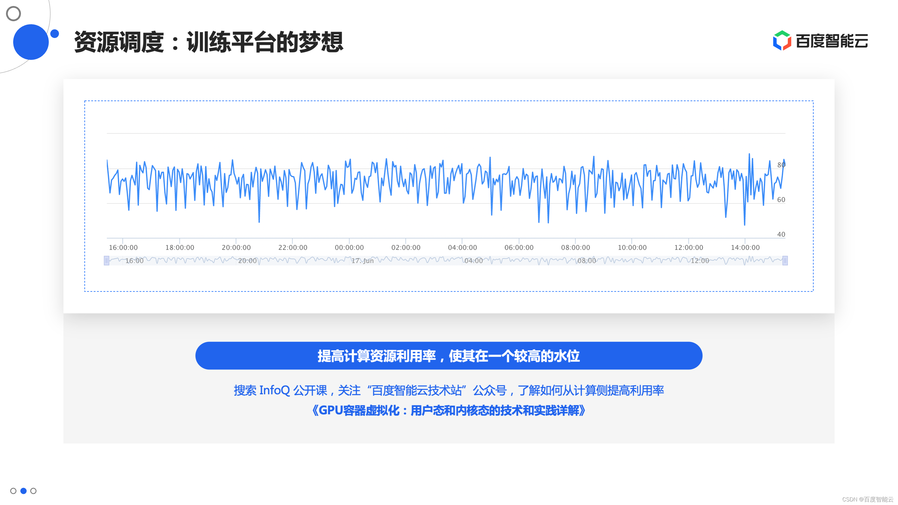 所有的训练平台都存在一个终极的梦想,就是让计算资源利用率维持在一个较高的水位。这个水位如果能到 60%+、70%+ 是一个很了不起的事情。这儿有些同学可能不能理解,平时的训练很容易达到 90%+ 的利用率呀,为什么上了训练平台就下降了呢?