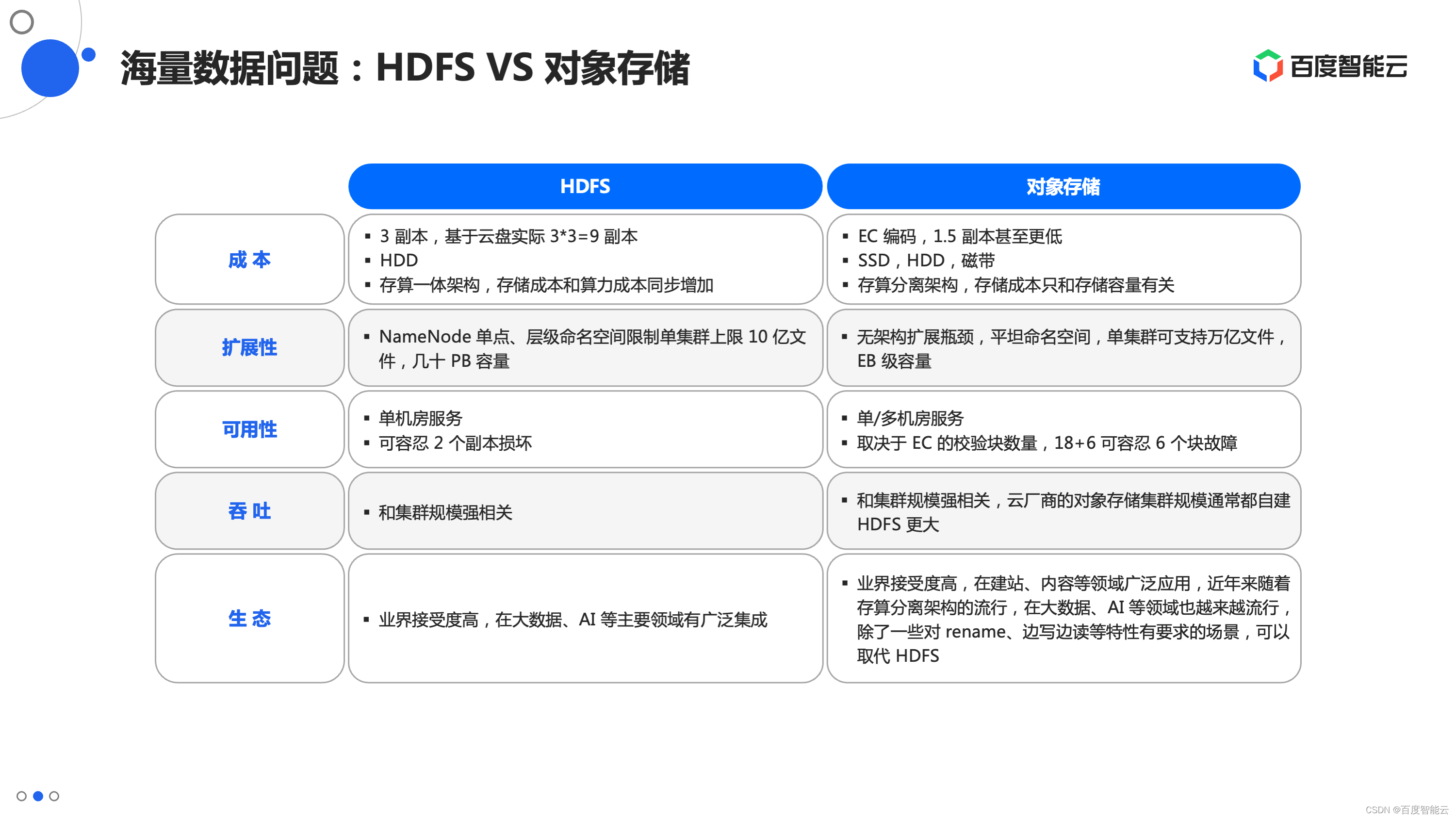 - 生态:两个系统都是接受度比较高的。对象存储缺乏对 rename、边写边读等特性的支持,使得它目前还不能满足部分大数据的场景需求。不过云厂商也在积极的解决这些问题,例如百度智能云推出了 RapidFS 和 BOS 层级 Namespace 作为补充。