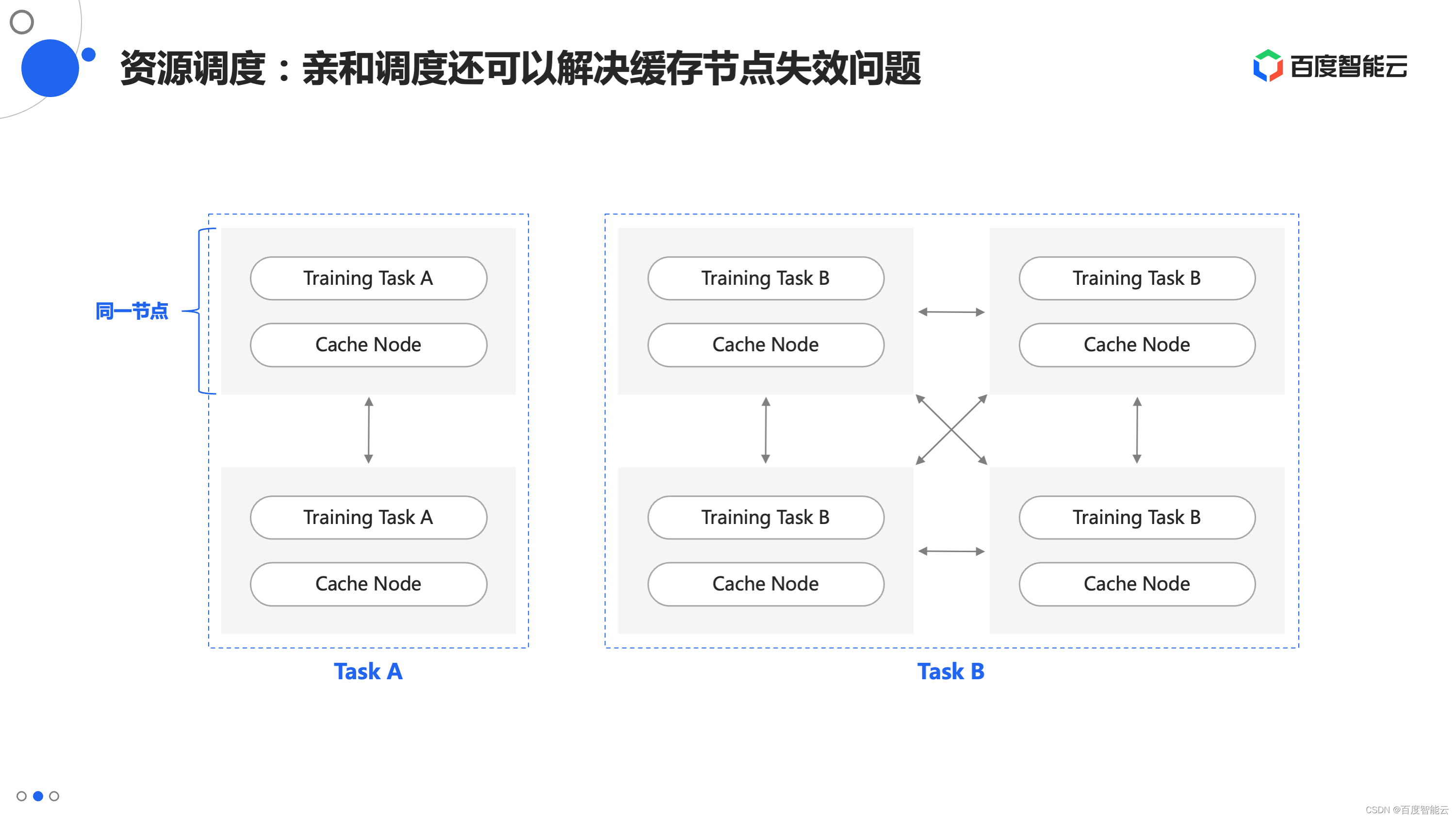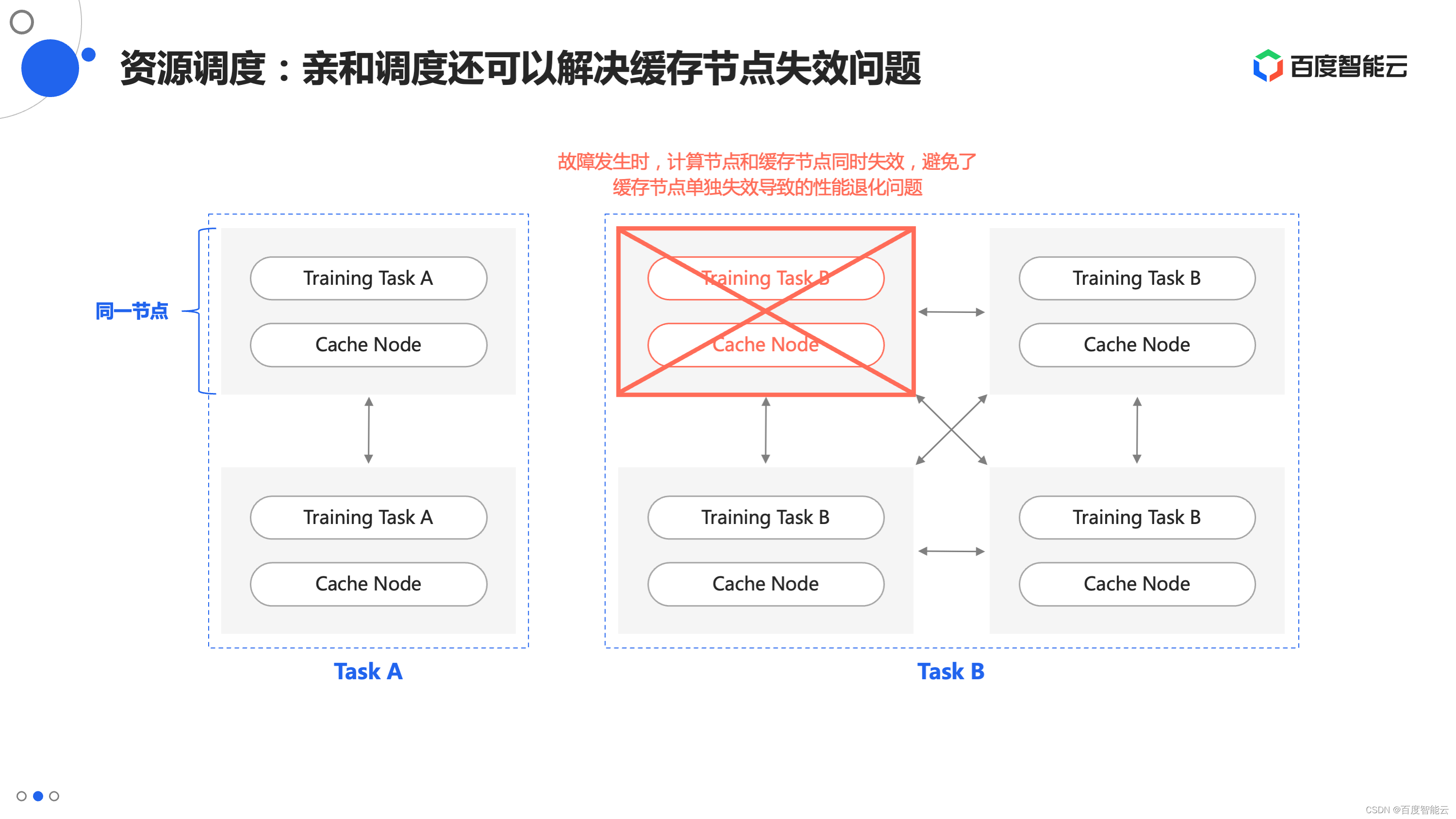 第二个好处是容错方面的。缓存系统和并行文件系统最大的一个差别是本身的容错能力较弱,缓存节点故障,就意味着其上的缓存数据失效。如果没有亲和调度,即使能够从远端重新拉取数据,也需要忍受一段时间的性能下降,这段时间会拉低计算资源的利用率。有了亲和调度之后,缓存节点和计算节点同时失效,在恢复计算任务前有机会先恢复缓存数据,就规避了性能退化的问题。