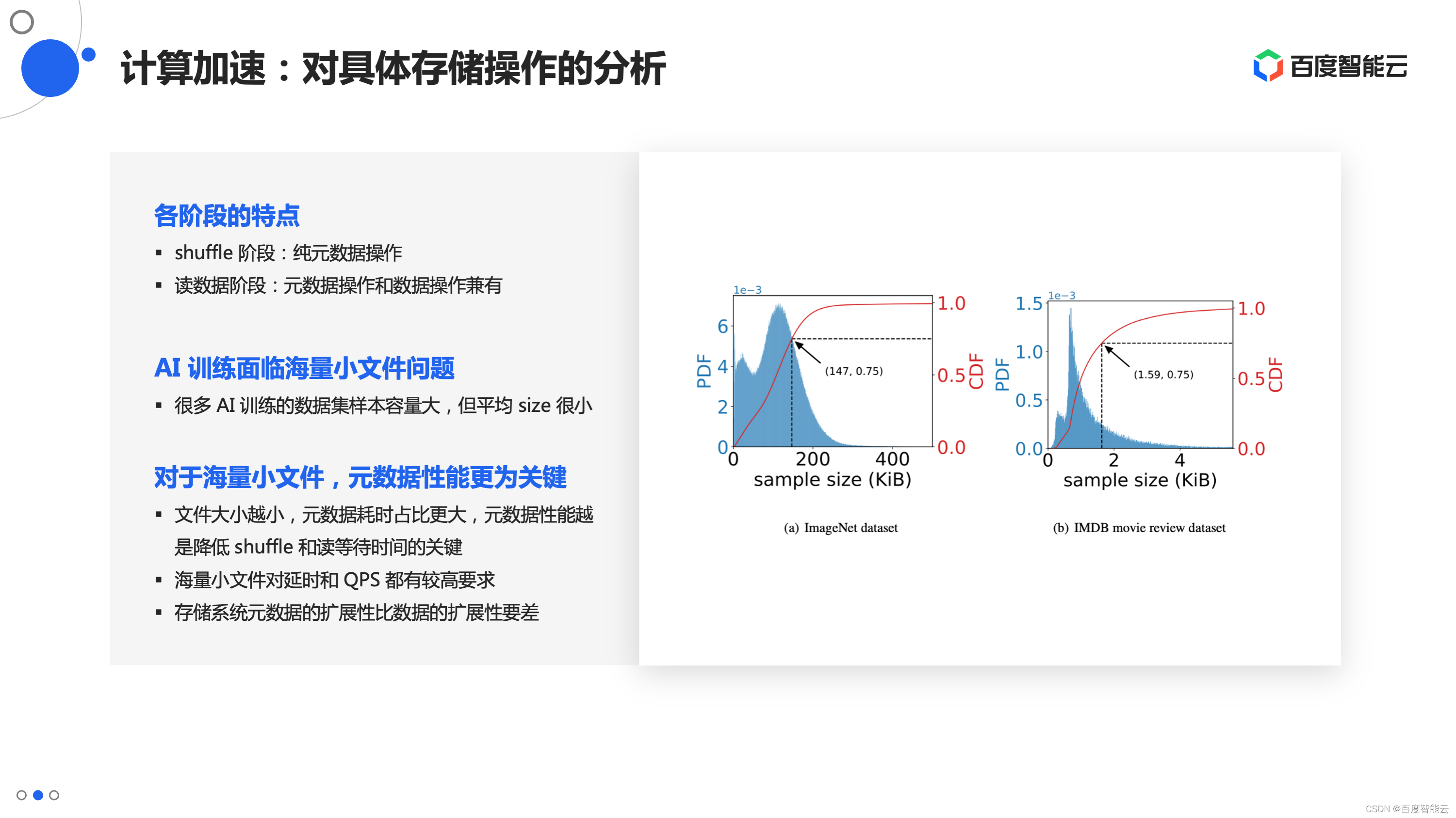 根据一些统计的结果,可以发现很多训练的样本集面临的情况是,样本数量非常大,但样本的平均大小又很小。以 ImageNet 数据集为例,整个数据集包含几百万(ImageNet 1K)、上千万(ImageNet 22k)的图片,平均一个图片大小仅为一百多 KB。这个大小对存储系统来说是非常小的。