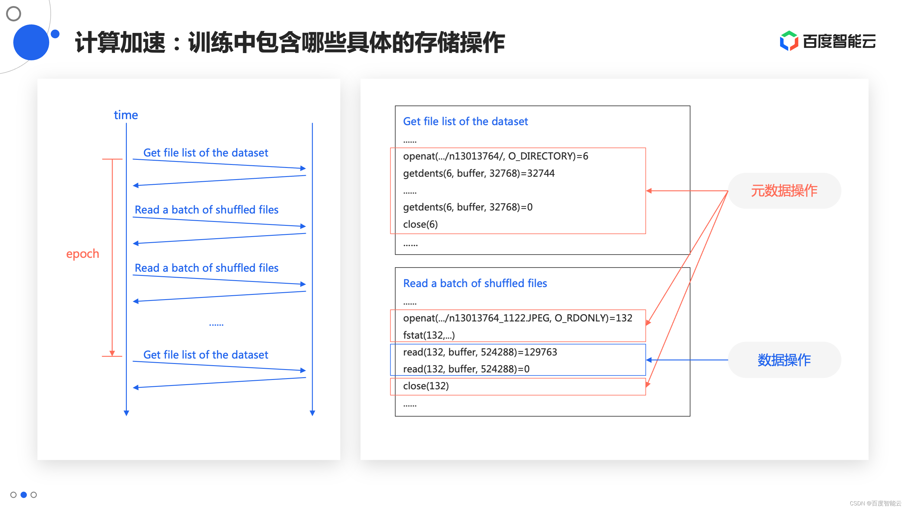 在 shuffle 阶段,需要把样本集包含哪些样本列出来,一种典型的朴素实现是将所有的样本按照目录分类存放,我们就可以通过文件系统提供的 ls 功能来枚举目录获取完整的文件列表,这时候就产生了大量的 open、getdents、close 操作,这些操作都可以归类为元数据操作。