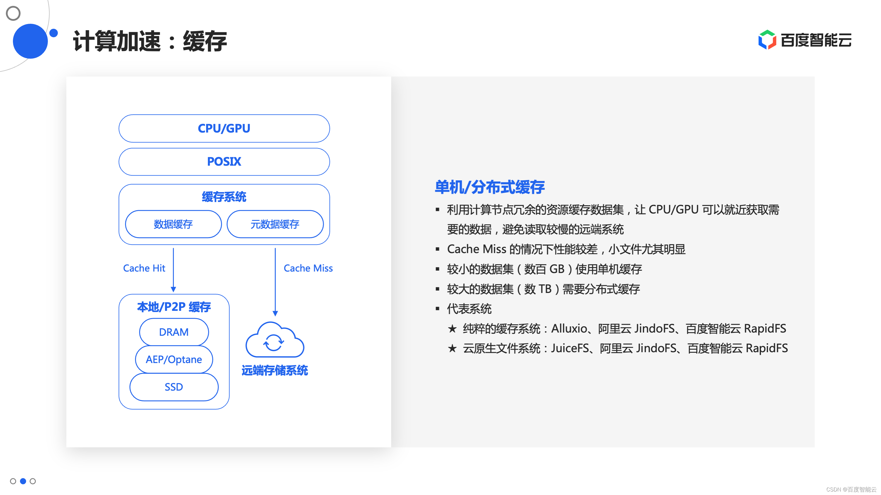 从我们之前的分析可以看出,AI 场景下对数据集的使用是只读的。因此,对于 AI 训练场景,缓存是一个非常好的优化手段。具体做法是将数据缓存到计算节点本地或临近节点的内存、磁盘上,达到就近访问的效果。缓存系统在 cache miss 的情况下需要从远端存储系统读取数据,性能是比较低的,训练中应该尽量避免这样的情况。